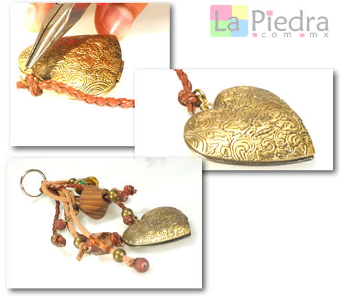 Vamos a tomar a nuestro dije mas grande en este caso el corazón color bronce como dije principal el cual será el mas llamativo en nuestra pieza, solamente colocamos una argolla y sobre la misma realizamos un nudo en la piel trenzada y listo! hemos terminado nuestro llavero, este modelo es un clásico el cual lo puedes realizar de los colores que gustes.
